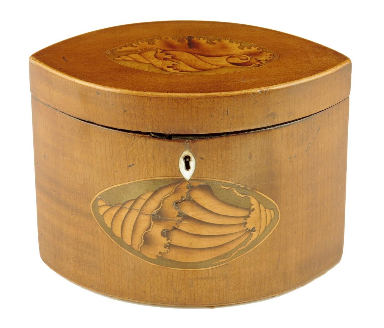 λ A George III harewood and marquetry navette shape tea caddy, inlaid with conch shells, with an ivory escutcheon and with a lidded interior, 12cm high, 15.6cm wide.
