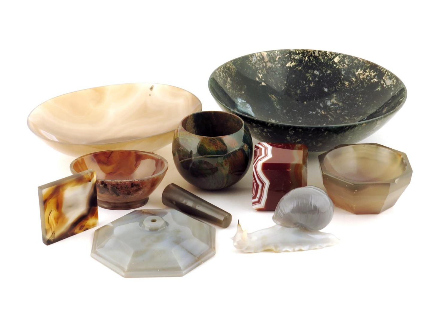 A collection of hardstone objects, including agate, bloodstone and chalcedony of bowls, a model snail, a paperweight and other items, 20cm diameter (max). (10)