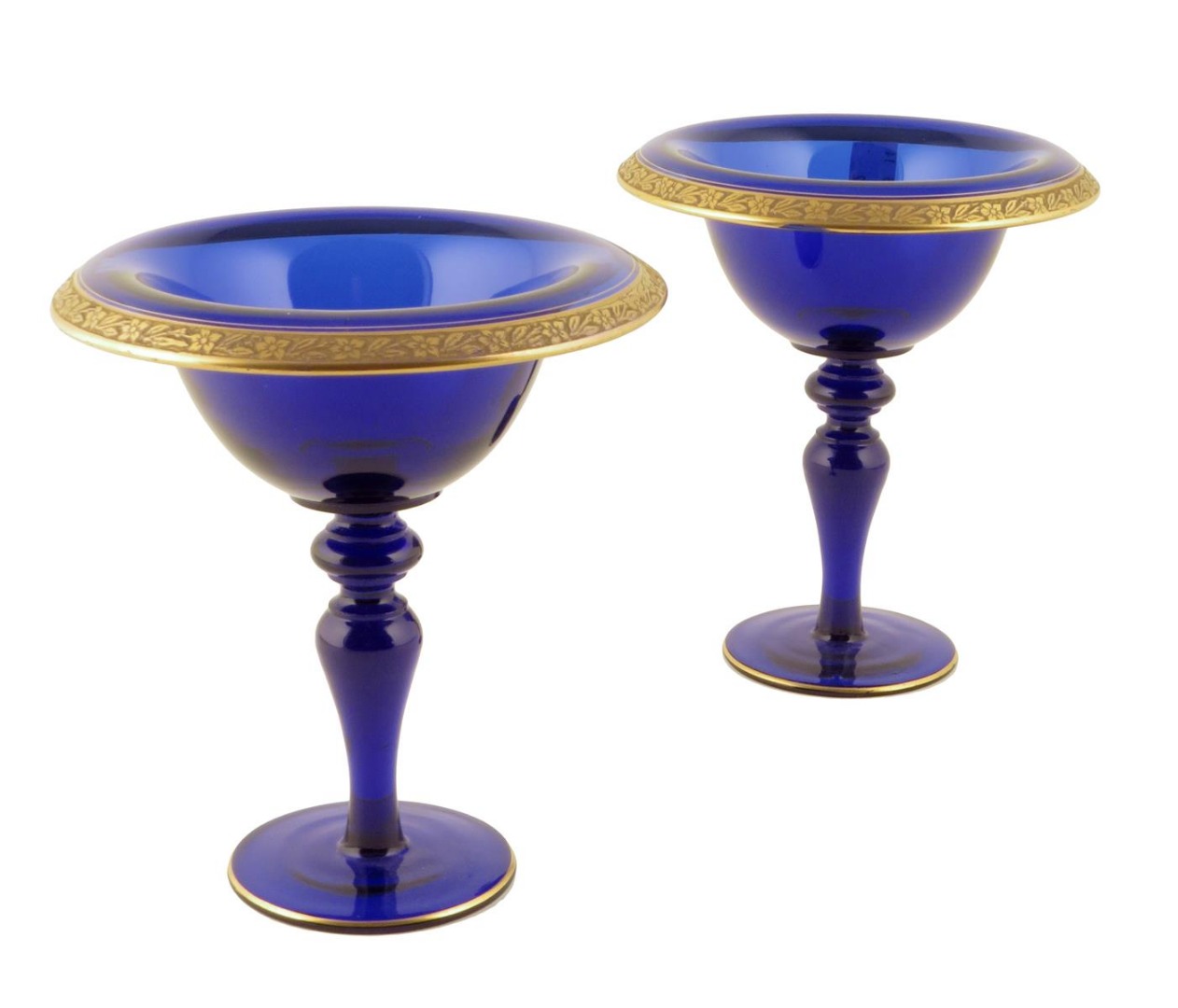 A pair of late 19th century blue glass tazzas, each with a flower and leaf gilt rim, 17.1cm high, 115.5cm diameter. (2)