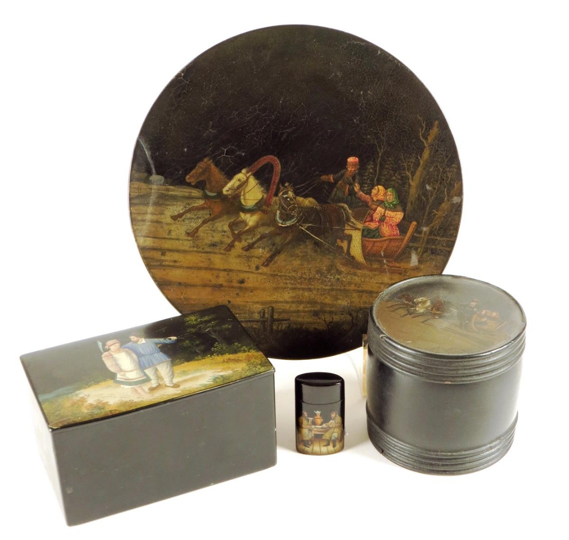 A small collection of late 19th century Russian lacquer items, comprising: a tea caddy, the hinged lid painted with a peasant man and woman, with a foil lined interior, together with a barrel caddy, the lid painted with a troika scene, a small box and cover painted with two men taking tea and a circular plate painted with a troika scene, 22.3cm diameter (max). (4)