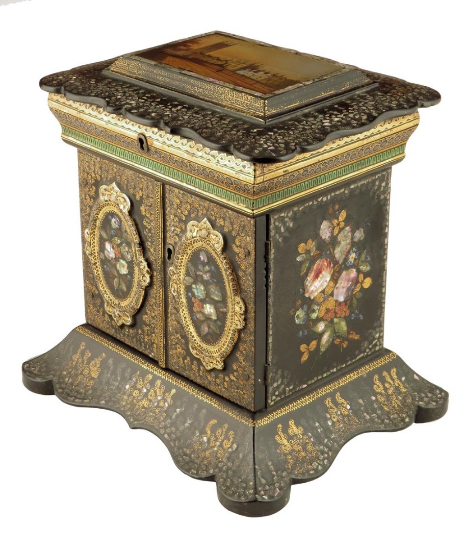 A Victorian papier-mache sewing table cabinet, decorated with gilt flowers and inlaid with mother of pearl, the hinged lid painted with a view of Magdalen Bridge and College, broken, revealing a plush lined and silk divided interior above a pair of panelled doors revealing three drawers, the sides with floral sprays, 26cm high, 26.4cm wide, 21.5cm deep.