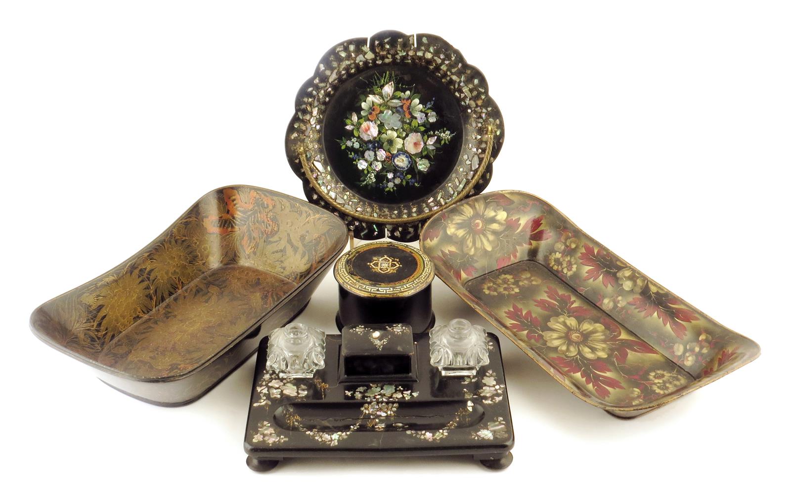 A Victorian papier-mache bowl by Clay, decorated in gilt with leaves, the base stamped 'CLAY KING ST. COVT GARDEN', 35.5cm wide, together with a Victorian papier-mache inkstand with two glass wells, a pot and cover, a tray with a brass swing handle and a tole bowl. (5)