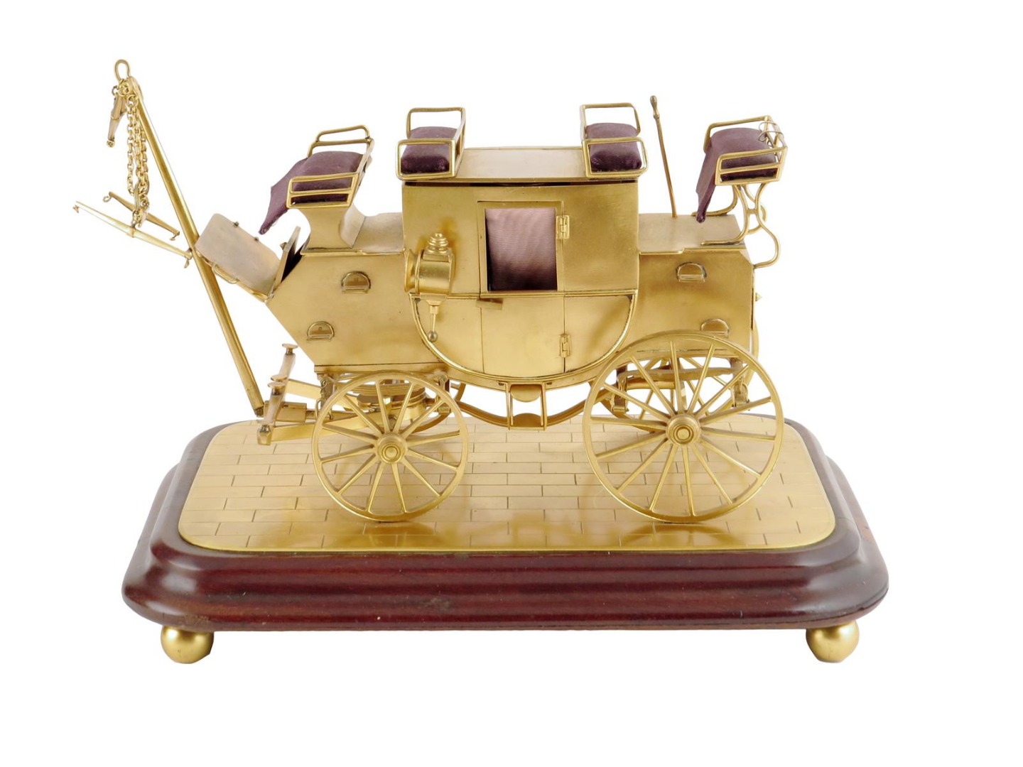 A gilt brass scale model of a 19th century carriage or coach, with hinged doors, mounted on a mahogany plinth with gilt ball feet, 20.8cm high, 32.8cm wide.
