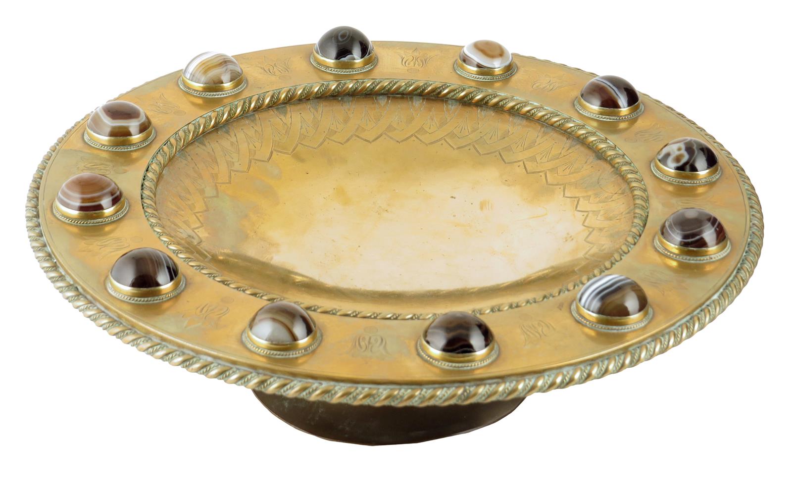 A Victorian gilt brass tazza, with engraved decoration and applied with agate cabochons, 10cm high, 31.3cm diameter.