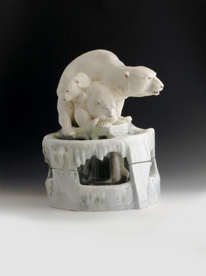 An Austrian pottery fishbowl, modelled with a polar bear and two cubs on an icy precipice, signed 'Marowicka', the interior with a glass bowl, the base with factory mark and inscribed 'VIENNA FAIENCE SCHAUER', with impressed marks 'D845F, DEPOSE 2363', early 20th century, 45.4cm high, 46m wide.