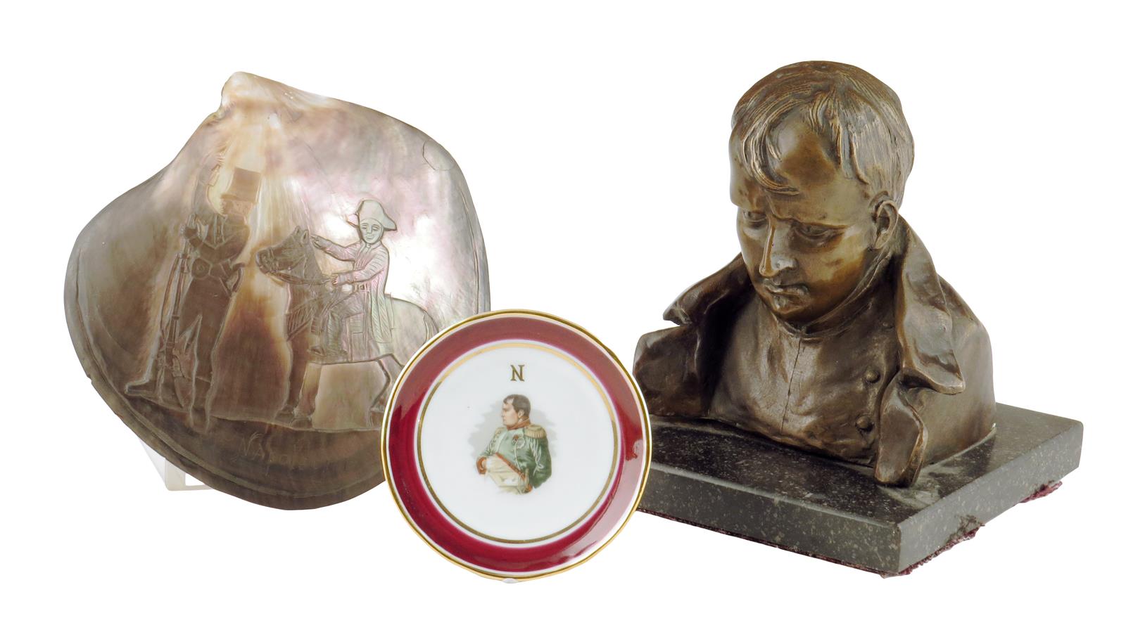 A bronze bust of Napoleon, on a marble plinth, 18.2cm high, together with a South Sea Island carved mother of pearl shell depicting Napoleon on horseback, titled and a French porcelain small plate printed with a portrait of Napoleon, gilt marks 'PORCELAINE DE LUXE'. (3)