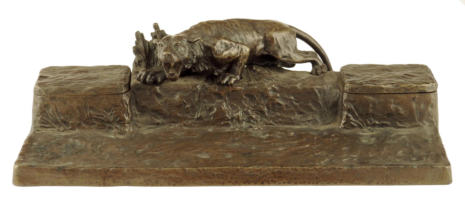 A bronze inkstand, naturalistically modelled with a lion, with a pair of hinged inkwell compartments, signed 'Martin', early 20th century, 10.5cm high, 37cm wide.