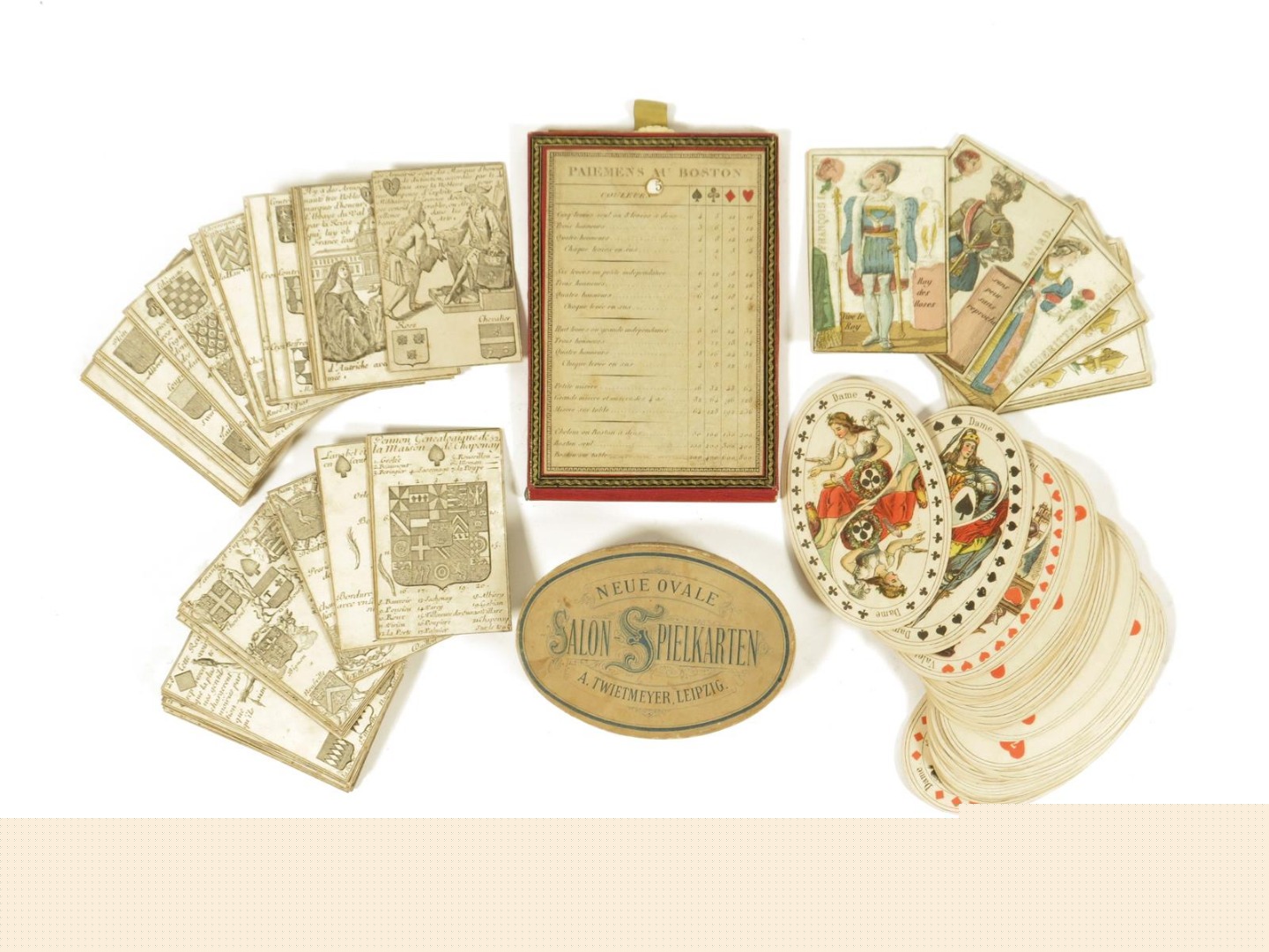 A set of fifty-three French engraved playing cards, the set decorated with coats of arms, kings and queens and other figures, probably late 17th century, together with twelve hand-coloured engraved French playing cards, decorated with famous historical figures including: Marguerite De Valois, François 1, Richelieu, early 19th century, a scorecard inscribed 'PAIEMENS AU BOSTON' with the rules, late 18th / early 19th century and a boxed set of German oval playing cards by A. Twietmeyer, the lid inscribed 'NEUE OVALE SALON SPIELKARTEN, A. TWIETMEYER, LEIPZIG' late 19th century. (A lot)