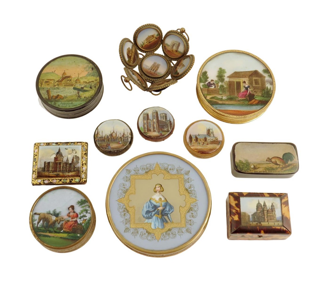 λ A 19th century French card and brass chocolate box, the lid with a printed portrait of a lady behind glass, the base with a printed label 'Au Fidele Berger, Yve AUCLER & P. LEDOUX, Rue des Lombards 46 & 48 Paris', two similar boxes one with a printed river scene with two figures, the other with a girl with a dog, a French gilt brass dish with printed views of Paris landmarks, three English pin cushions with reverse glass prints including Brighton Pavilion, a tortoiseshell box and a papier-mache plaque with a view of St. Paul's Cathedral together with two snuff boxes, 11.8cm wide (max). (11)