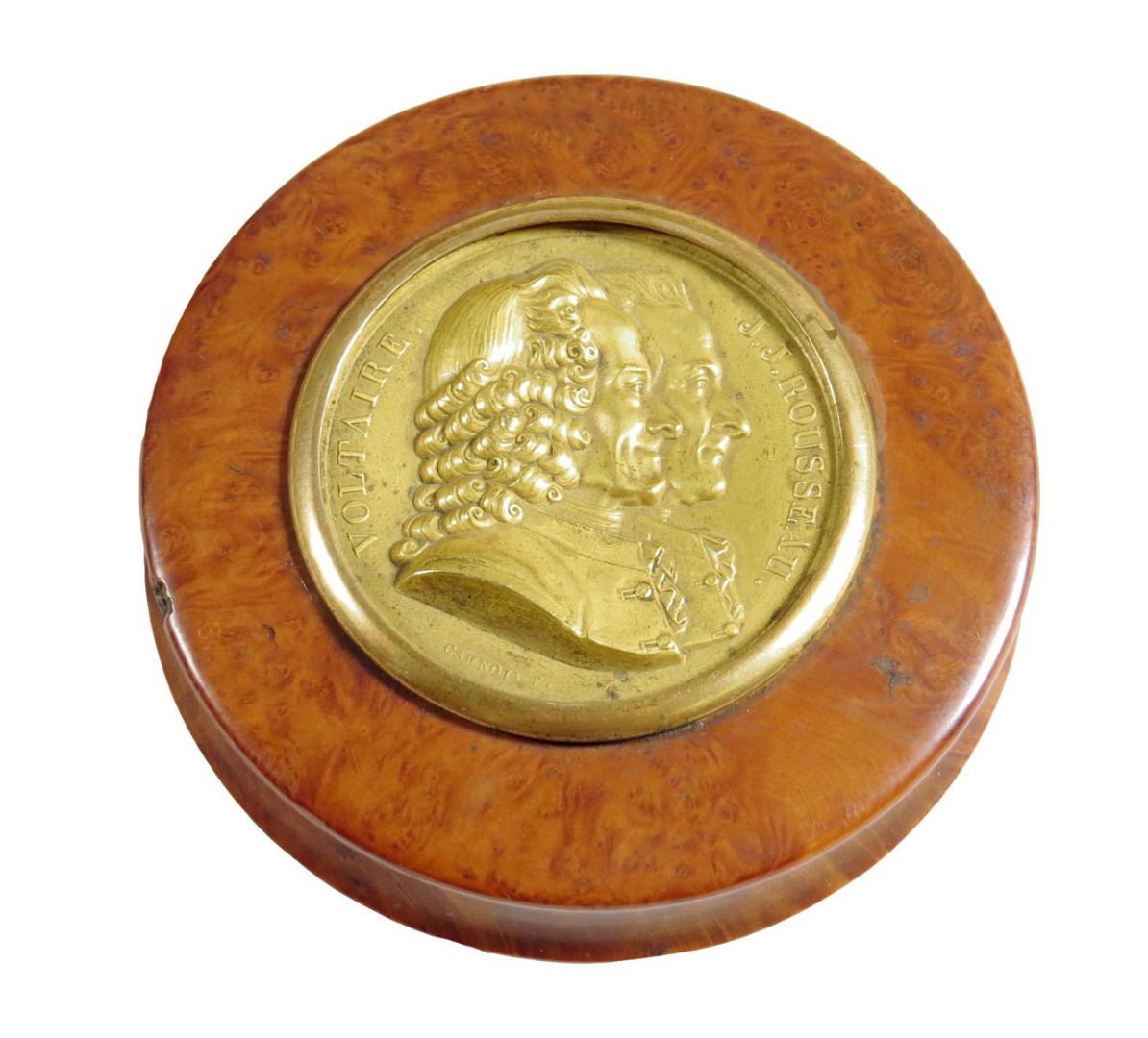 A 19th century French burr maple snuff box, the lid inset with a gilt bronze double portrait relief medallion of Voltaire and Rousseau after Francois Caunois, signed, with a tortoiseshell lined interior, 8cm diameter.