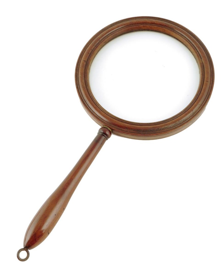 λ An early Victorian rosewood gallery glass, with a moulded frame and a turned handle, the end with a metal suspension ring, 37.5cm long, 18.5cm diameter.