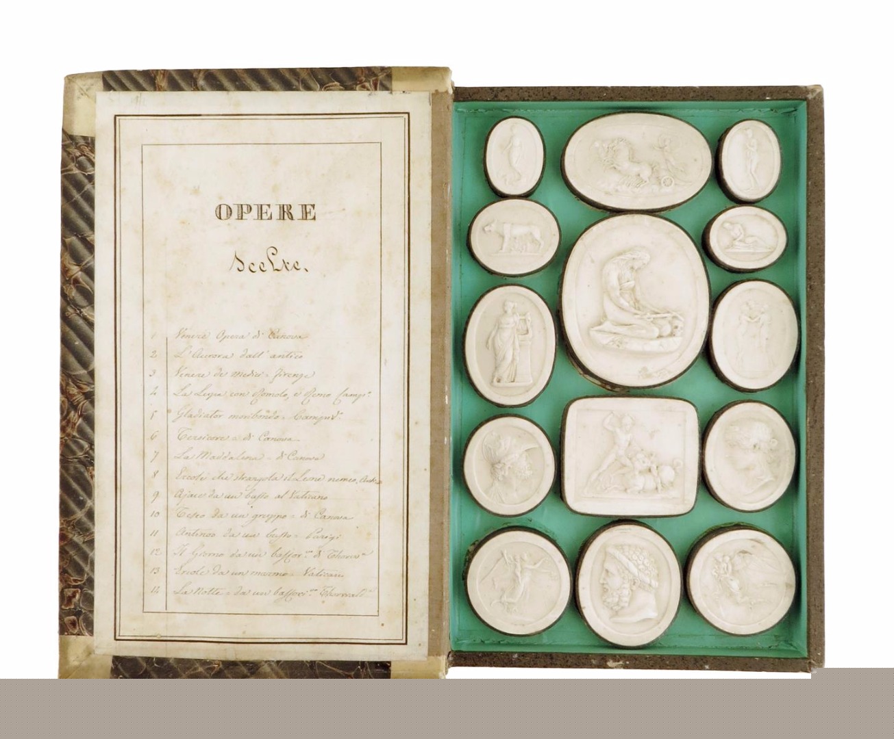 An early 19th century Italian Grand Tour 'book' of plaster intaglios, titled 'LIBEROTTI IMPRONTE, OPERE SCELTE', with a hinged cover revealing fourteen medallions after Canova, Thorwaldsen and the antique, with a titled list of works to the inside of the lid, 25.3cm x 16.5cm.