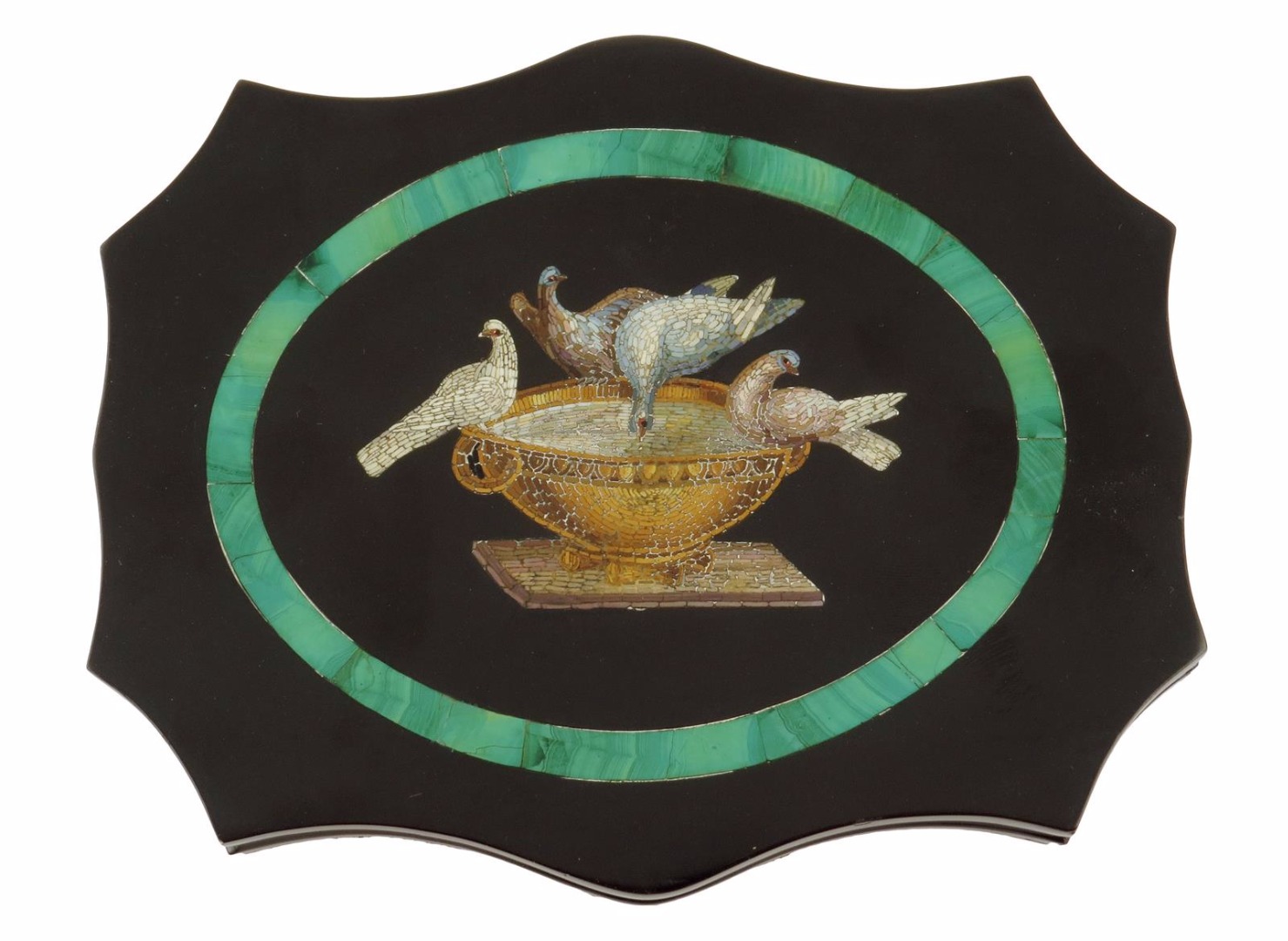 A late 19th century Italian micromosaic paperweight, of serpentine outline, the centre inlaid with the 'Doves of Pliny', within a malachite band, 14.5 x 18cm.