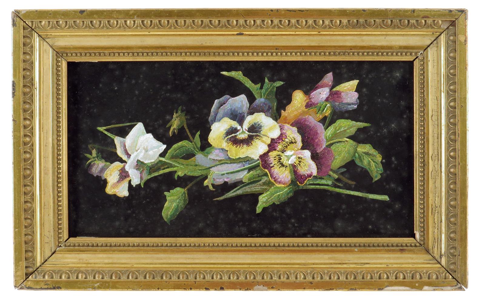 A late 19th century Italian Vatican workshop micromosaic plaque, depicting pansies within a giltwood and composition frame, the reverse with a printed paper label inscribed 'REV. FABB CA DI S. PIETRO IN VATICANO', with ink inscriptions '1269 lira 190', and with the buyer's name and address in pencil, the plaque 15.5 x 29.5.