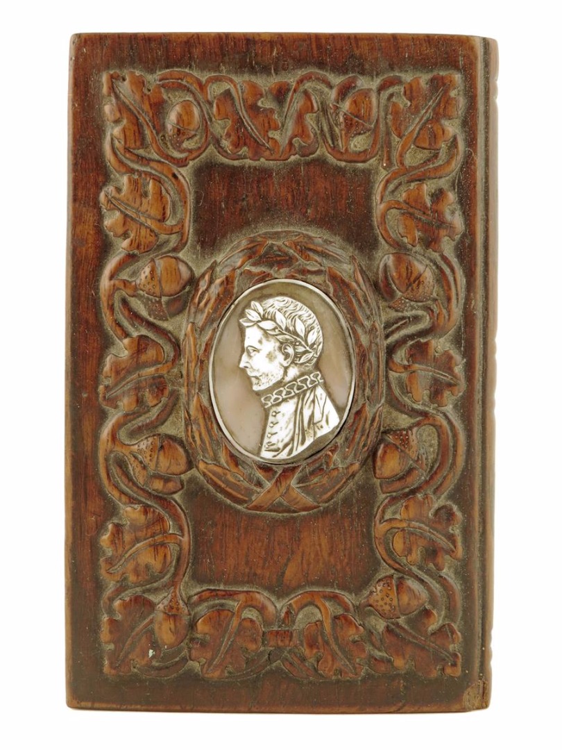 A 19th century Italian carved oak 'book paperweight', the top with a band of oak leaves and acorns with a laurel wreath bordering a central carved cameo portrait bust of a man, the underside inscribed in ink 'Florence 1857', 14.4 x 9.2cm.