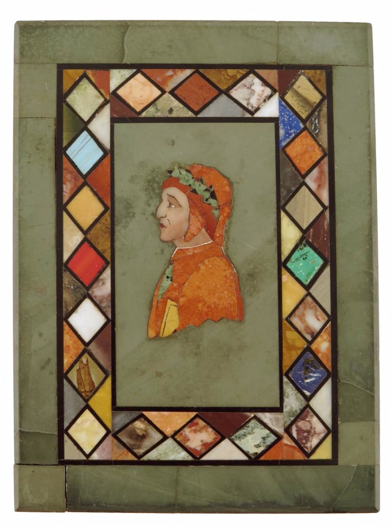 A late 19th century Italian Florentine pietra dura paperweight, the centre decorated with a portrait of Dante within a band of specimen stones, 16 x 12cm.