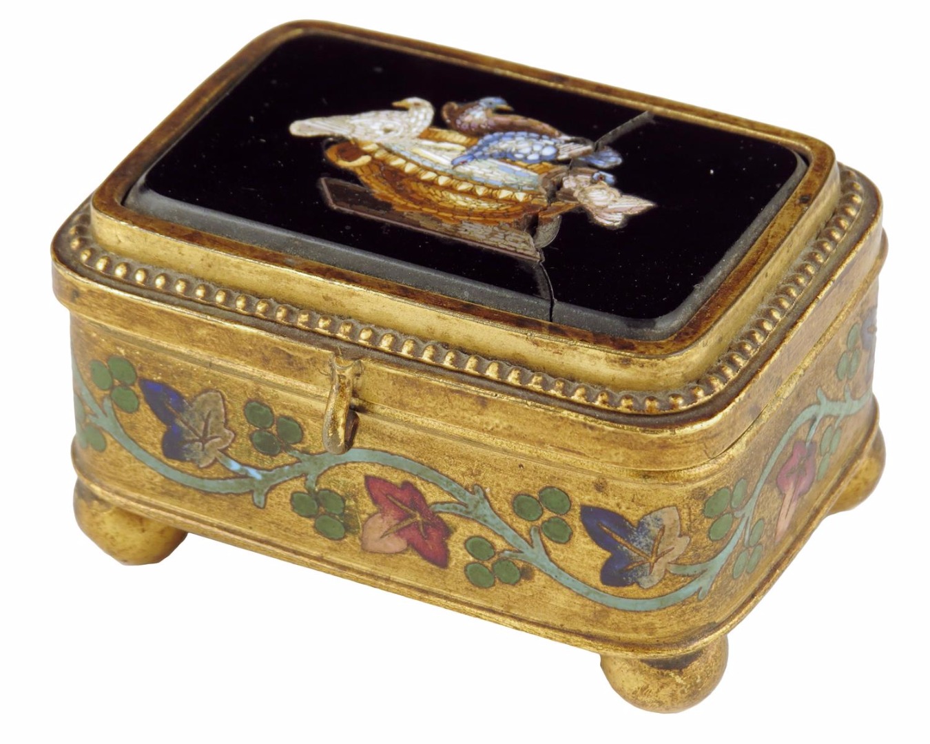 A late 19th century gilt metal trinket box, the hinged lid inset with a micromosaic panel depicting the 'Doves of Pliny', cracked, 3.8cm high, 7cm wide.
