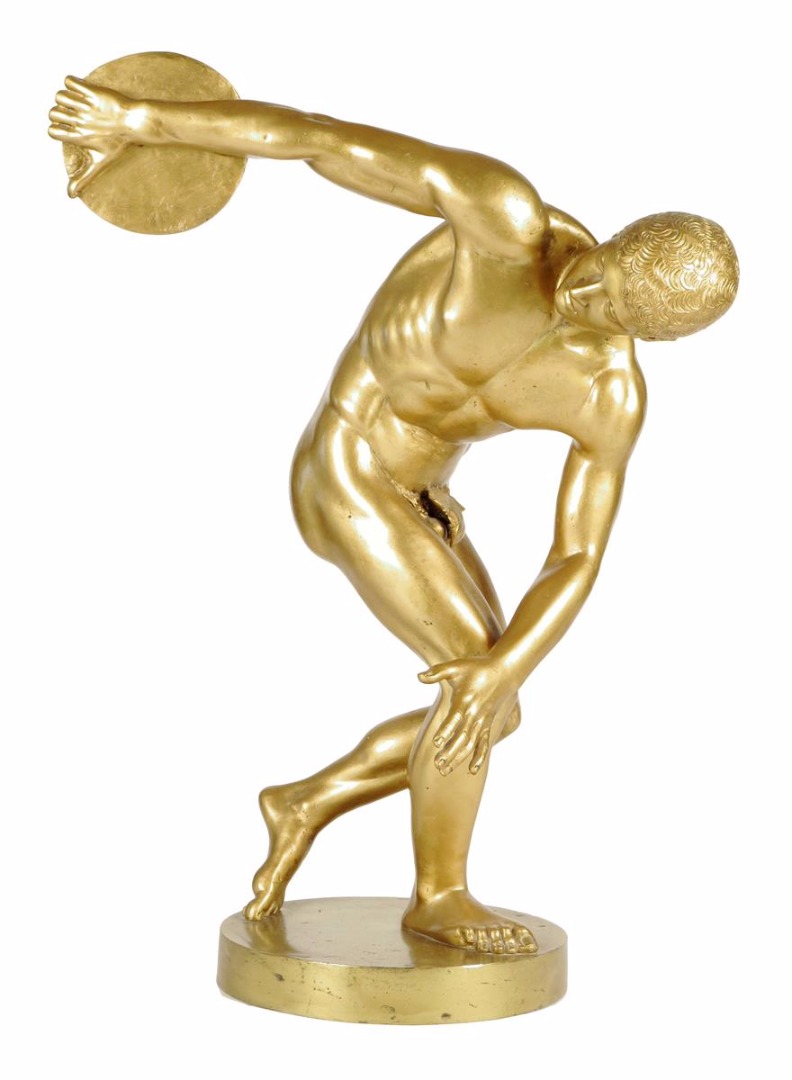 After the antique. An Art Deco gilt bronze figure of Discobolus, standing on a circular plinth, 63cm high, 45cm wide.