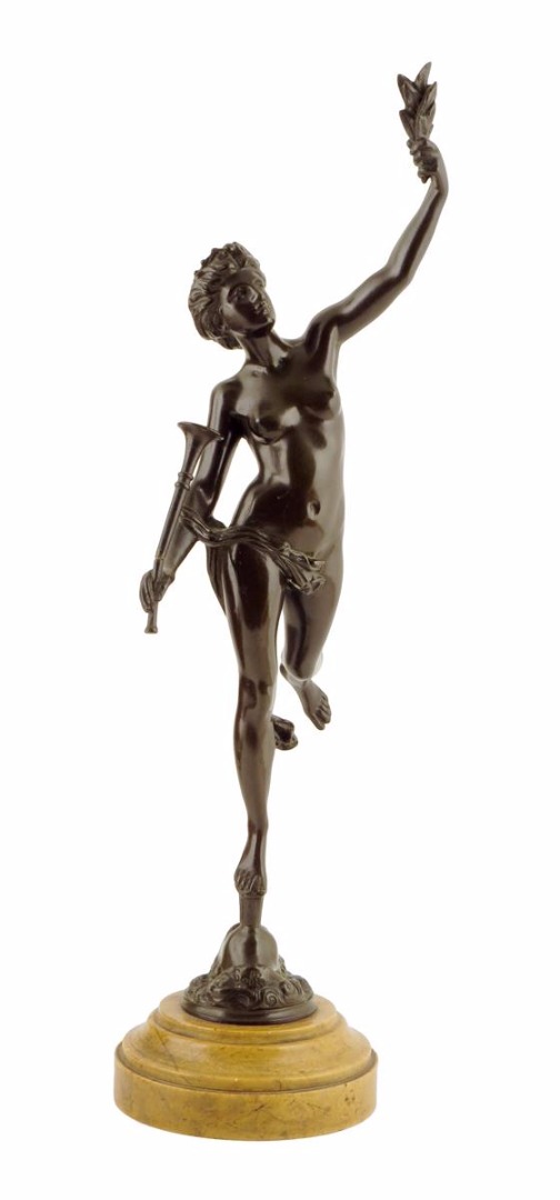 After Giambologna (Flemish 1529-1608). A 19th century bronze figure of Fortuna, signed indistinctly, on a stepped circular Siena marble base, 47cm high.