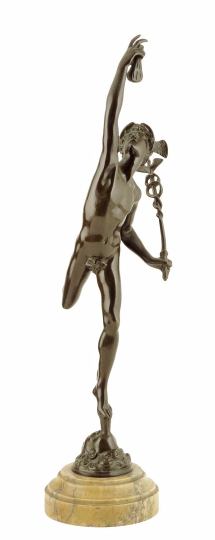 After Giambologna (Flemish 1529-1608). A 19th century bronze figure of Mercury, signed 'J de Bgna', on a stepped circular Siena marble base, 48.4cm high.