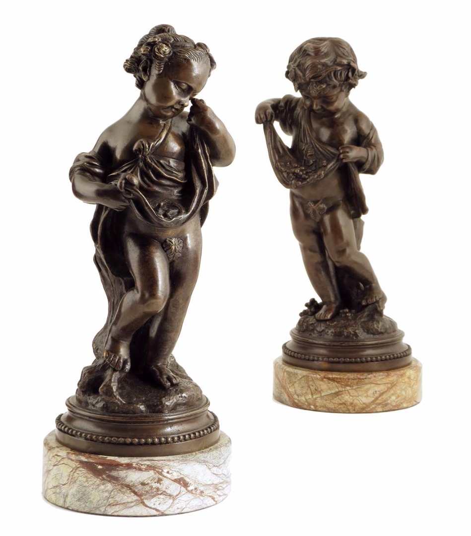 After Claude Michel known as Clodion (French 1738-1814). A pair of bronze figures of cherubs, one holding grapes in his tunic, the other with a bird's nest, on a marble base, 33.8cm high.
