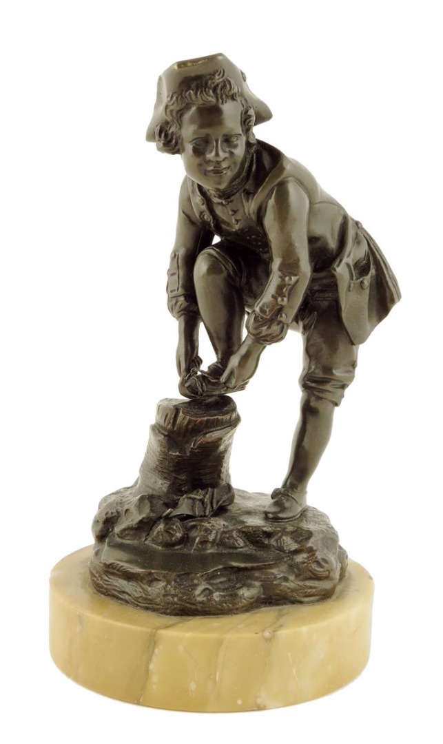 A 19th century French bronze figure of an ice-skater, standing on a naturalistic base putting on his skates, signed 'Sevres' on a Siena marble plinth, 18.5cm high.