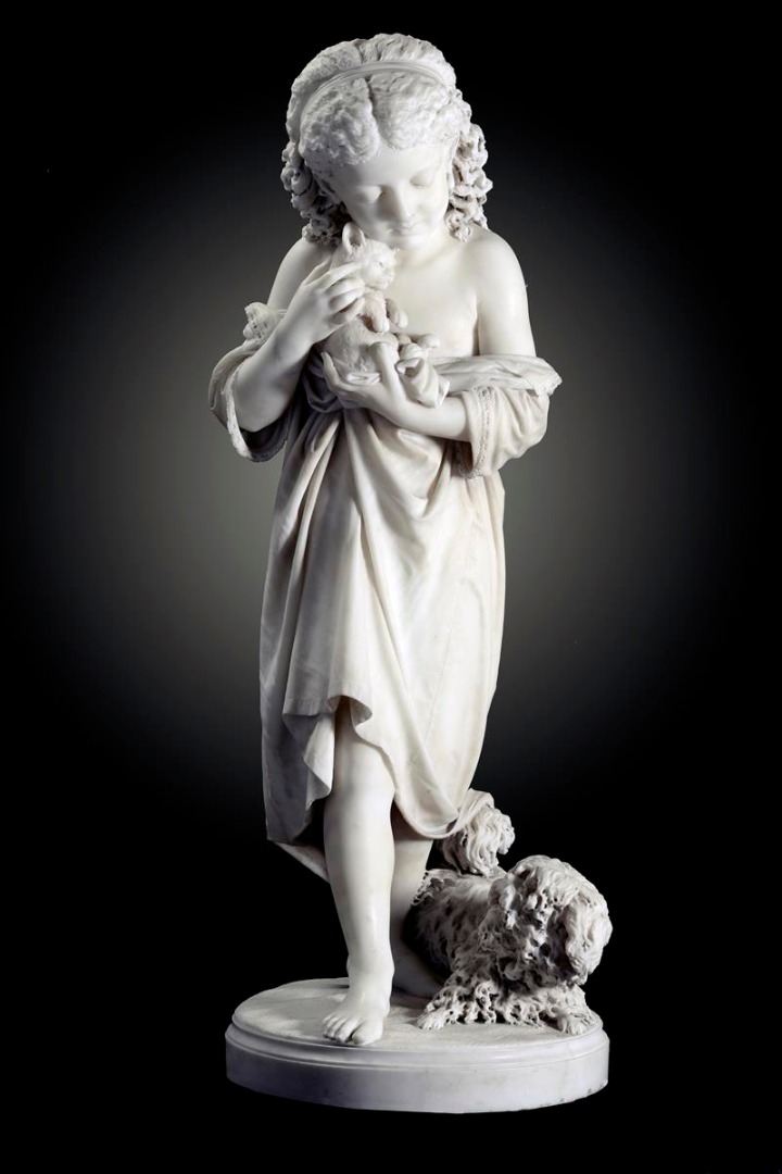 Ugo Zannoni (Italian 1836-1919). A 19th century white marble figure, 'Her Favourite Pets', signed and dated 'UGO ZANNONI FECIT MILANO 1875', 110cm high, 41cm wide.