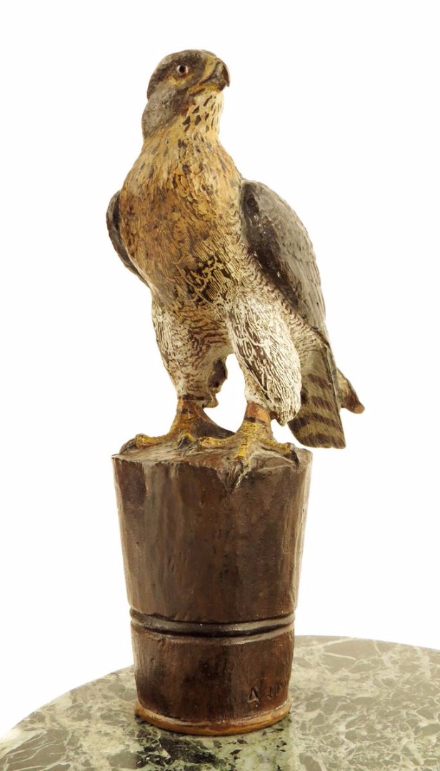 Falconry interest. A pair of early 20th century cold painted bronze models of falcons, each standing on a plinth, one hooded, one with glass eyes, both signed 'A N MILLER', both mounted on marble ashtrays, possibly originally car mascots, the bronzes: 14.7cm high, the ashtrays: 22.5cm wide (max). (2)