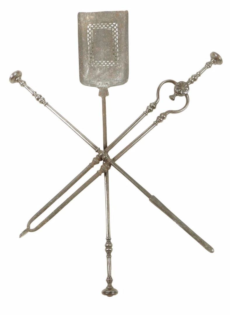 A set of three 19th century steel fire tools, each with a disc finial handle and a knopped stem, with a pierced pan, 75cm long (max). (3)