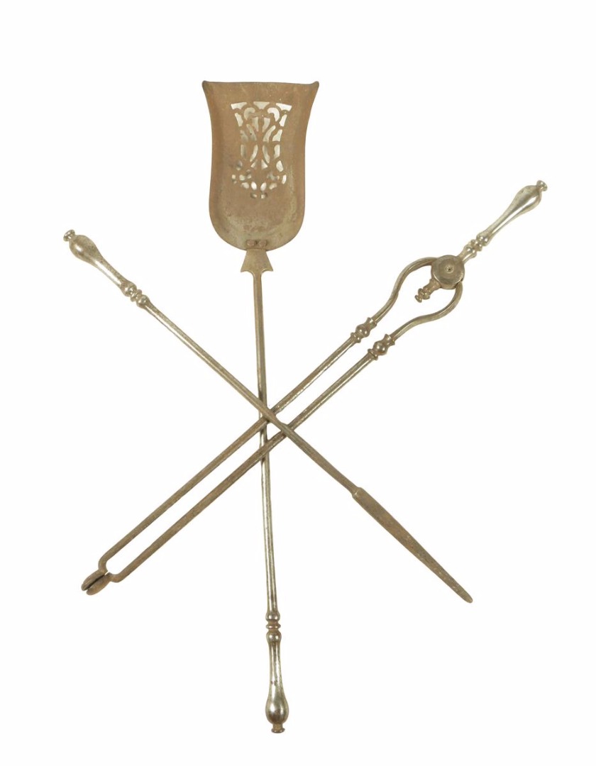 A set of three Victorian steel fire tools, each with a baluster handle, with a pierced pan, 75.4cm long (max). (3)