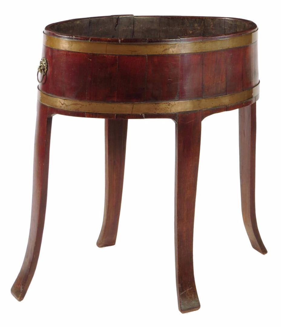 A teak and brass bound planter by Maple & Co., the interior with an associated lift-out copper liner, with lion's mask ring handles, the base with an oval brass plaque, early 20th century, 76.4cm high, 85.1cm wide, 53.5cm deep.
