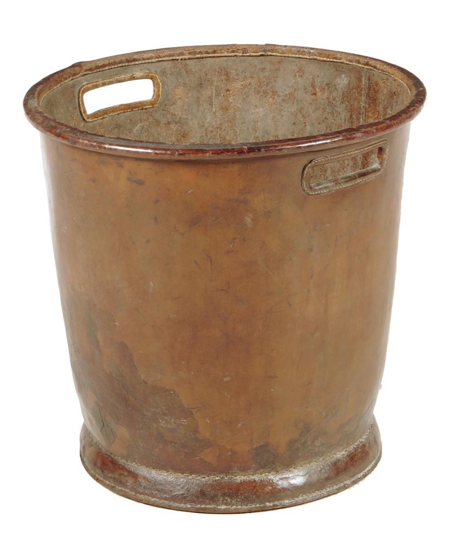 A leather bucket, with two pierced handles, 39.1cm high, 40.8cm diameter.
