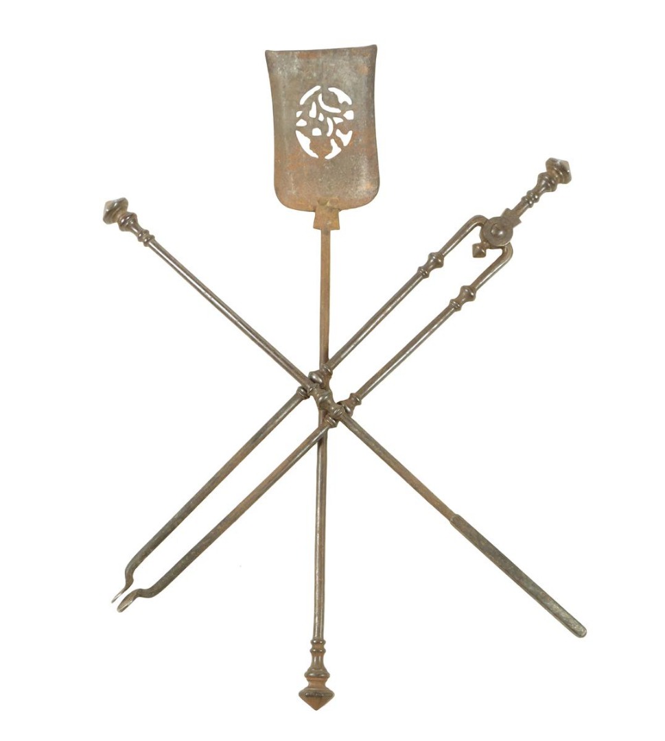 A set of three William IV steel fire tools, each with a faceted mushroom finial handle and knopped stems, with a pierced pan, 77.4cm long (max). (3)