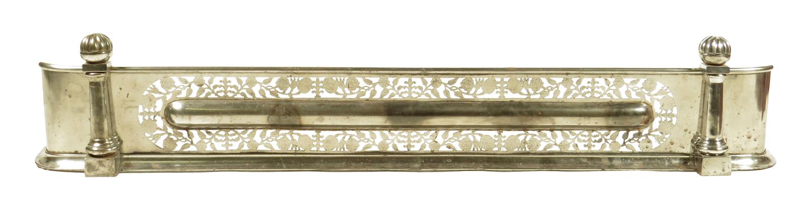 An early 19th century polished steel fender, with a pair of columns with lobed finials flanking a baton and pierced and engraved flowers and foliage, 22.2cm high, 125.1cm wide, 26.5cm deep.