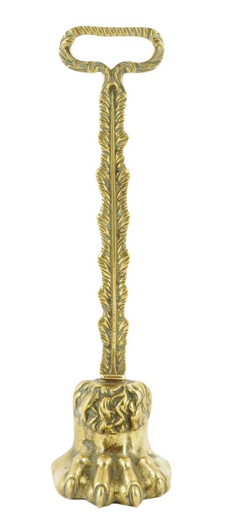 A Victorian brass lion's paw doorstop, with an open handle and leaf cast stem, 38cm high.