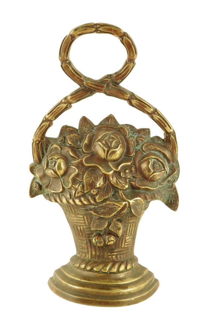 A Victorian brass doorstop in the form of a basket of flowers, with a laurel wreath handle, 32.1cm high.