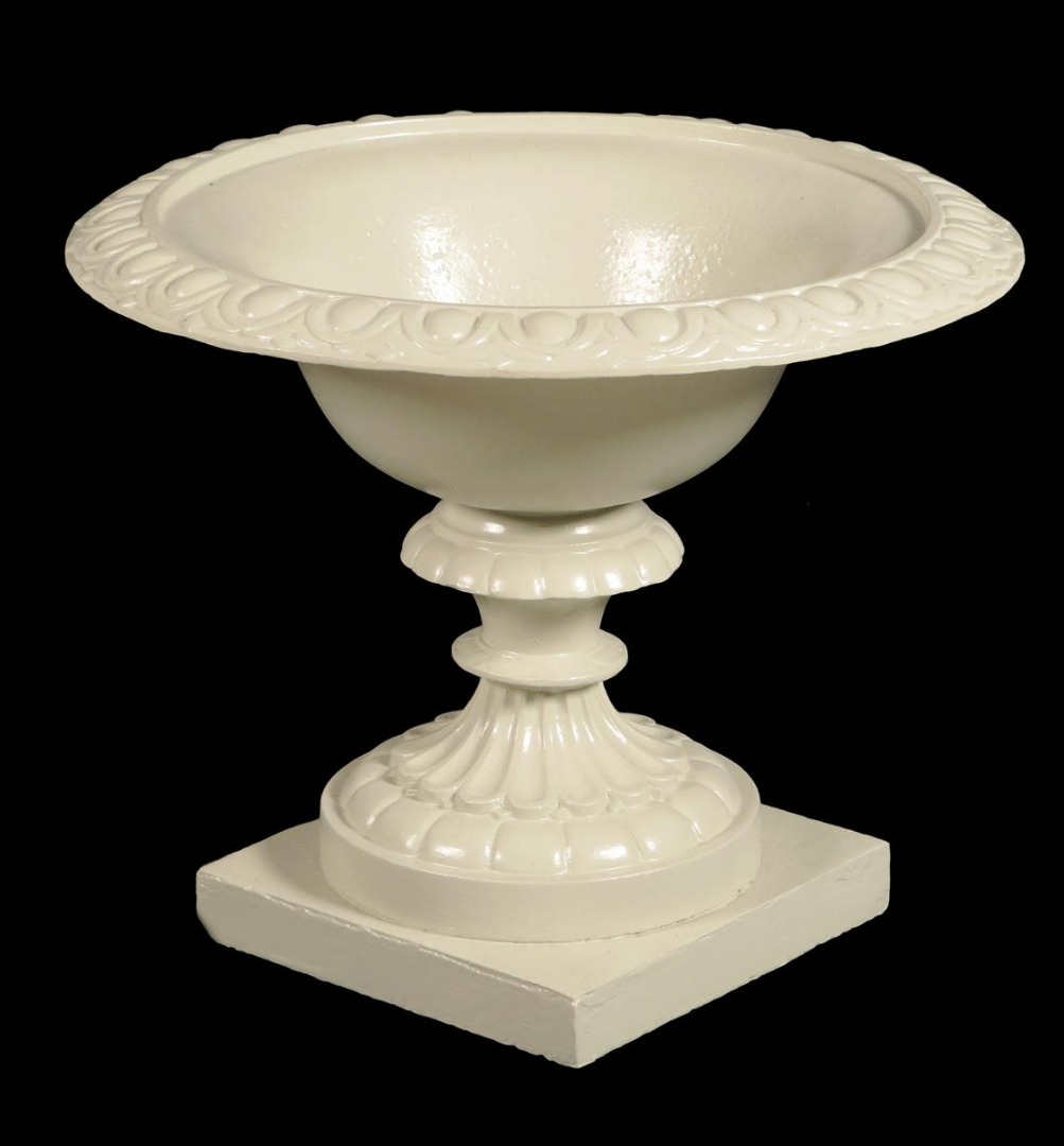 A late Victorian painted cast iron urn, with an ovolo moulded rim, the edge of the bowl with impressed registration and kite marks and 'No 3', on a fluted and lobed foot, 39cm high, 47cm diameter.