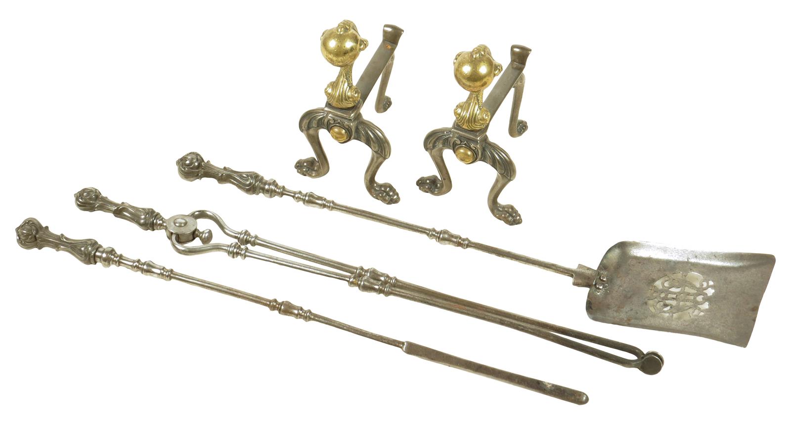 A set of three early Victorian steel fire tools, each with a lappet cast handle and knopped stem, with a pierced pan, 71.5cm long (max), together with a pair of steel and gilt brass andirons with a claw and ball finial on lion's paw feet, with traces of a registration number. (5)