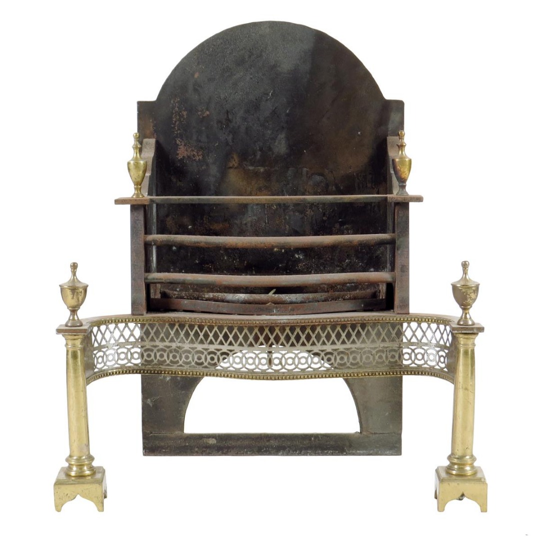 A cast iron and brass serpentine fire-grate in George III style, the arched back above a rail front with a pierced frieze and with urn finials, 71cm high, 60.6cm wide, 31.5cm deep.
