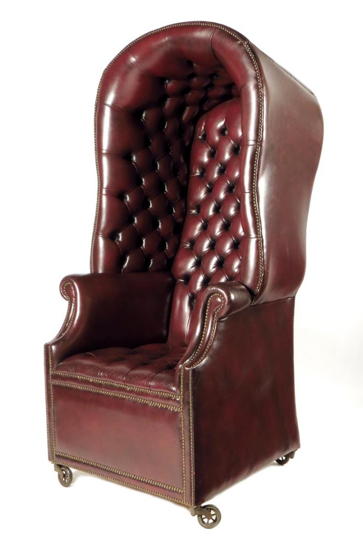 A leather porter's chair, with a button back and seat with studded burgundy leather upholstery on spoke castors, mid 20th century.