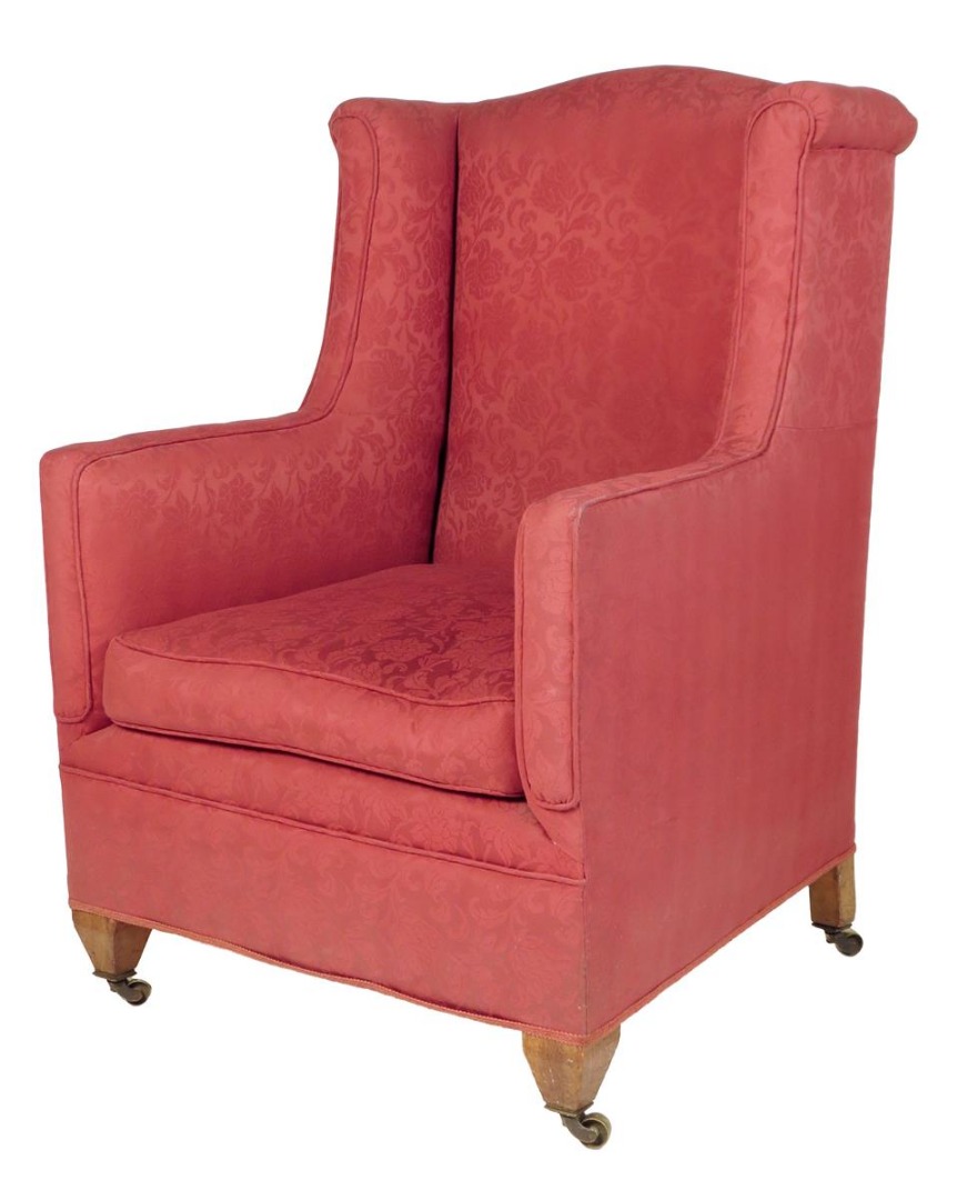 A late Victorian wing armchair, later upholstered with red damask fabric on oak supports and brass castors.