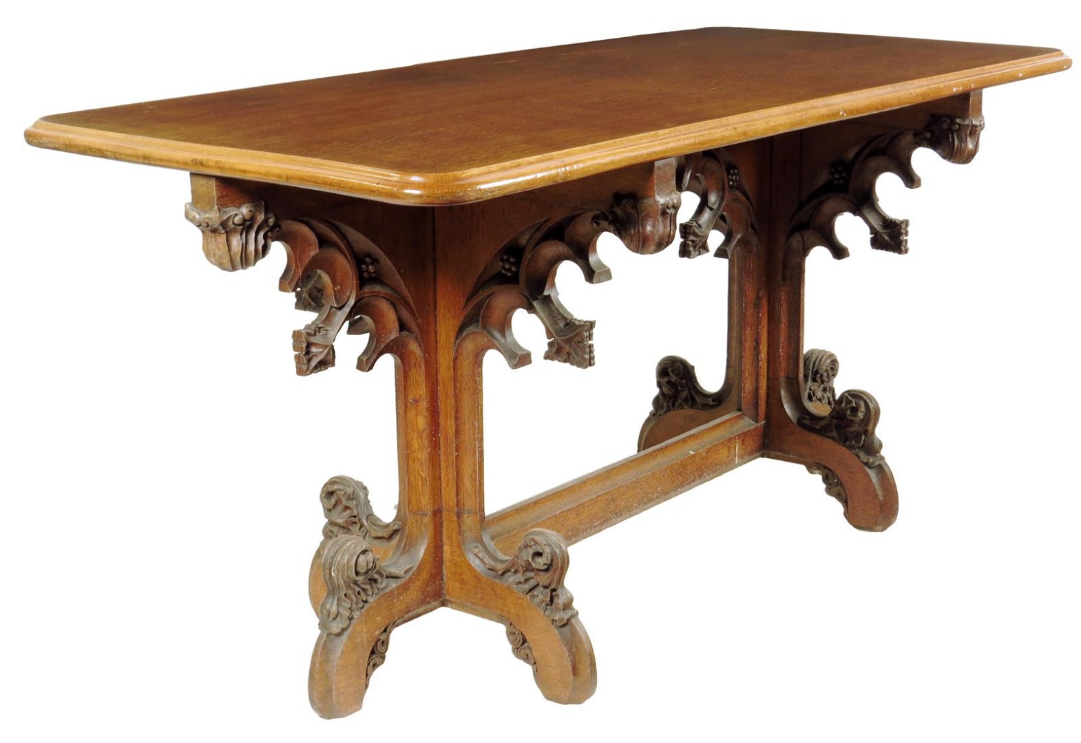 A Victorian oak Gothic library table in the manner A.W.N. Pugin