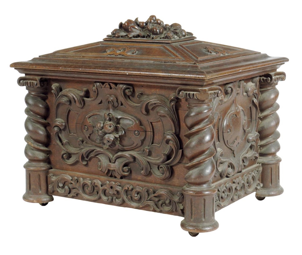 A Victorian carved oak ice box, of sarcophagus shape, the hinged lid with a fruit and leaf panel, the interior with a lift-out metal liner with spiral twist columns and leaf carved cartouche panels, on brass castors, 54.5cm high, 66.8cm wide, 52cm deep.