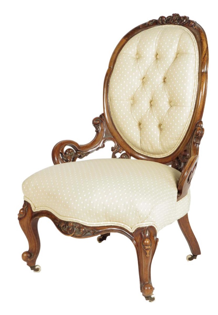 A Victorian walnut nursing chair, with a carved and moulded frame with later fabric on cabriole legs and ceramic castors.