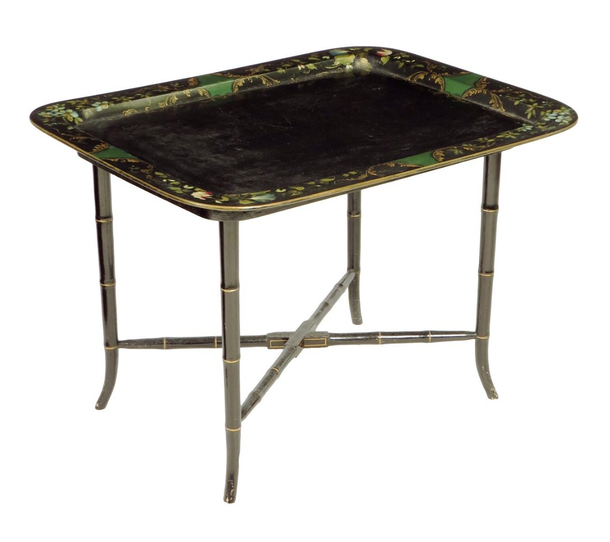 A Victorian papier-mache tray, painted with a band of scrolling leaves and flowers on a later ebonised faux bamboo stand, 52cm high, 76.5cm wide, 59.2cm deep.
