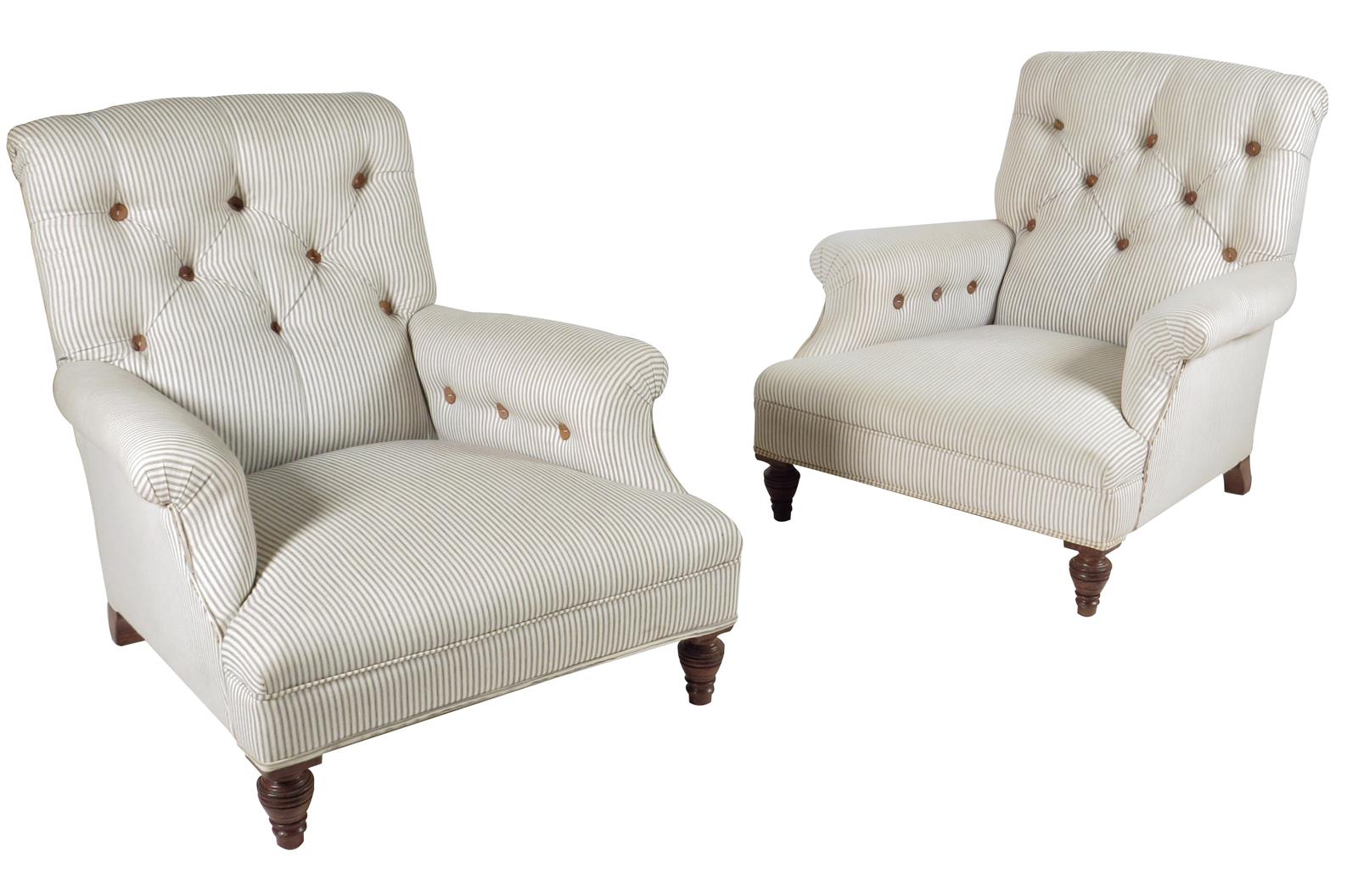 A pair of late Victorian easy armchairs in the manner of Gillows, each upholstered with blue striped fabric with stitched leather buttons, on turned walnut front legs. (2)