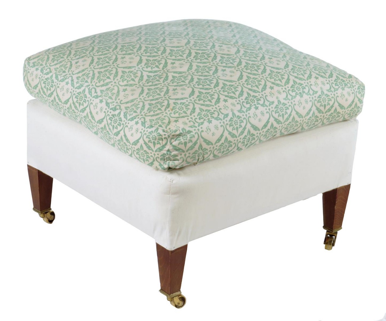 A Lenygon & Morant 'Howard' stool, with loose covers and part 'H & S' monogrammed ticking, on beechwood tapering legs and brass castors, the underside with a label inscribed 'LENYGON & MORANT LTD MAKERS OF HOWARD CHAIRS AND SETTEES, 48 SOUTH AUDLEY ST. LONDON W.1. 1622 WG', one leg stamped 'HOWARD CHAIRS 48 STH AUDLEY ST. 1829', 46.2cm high, 58.5cm square.