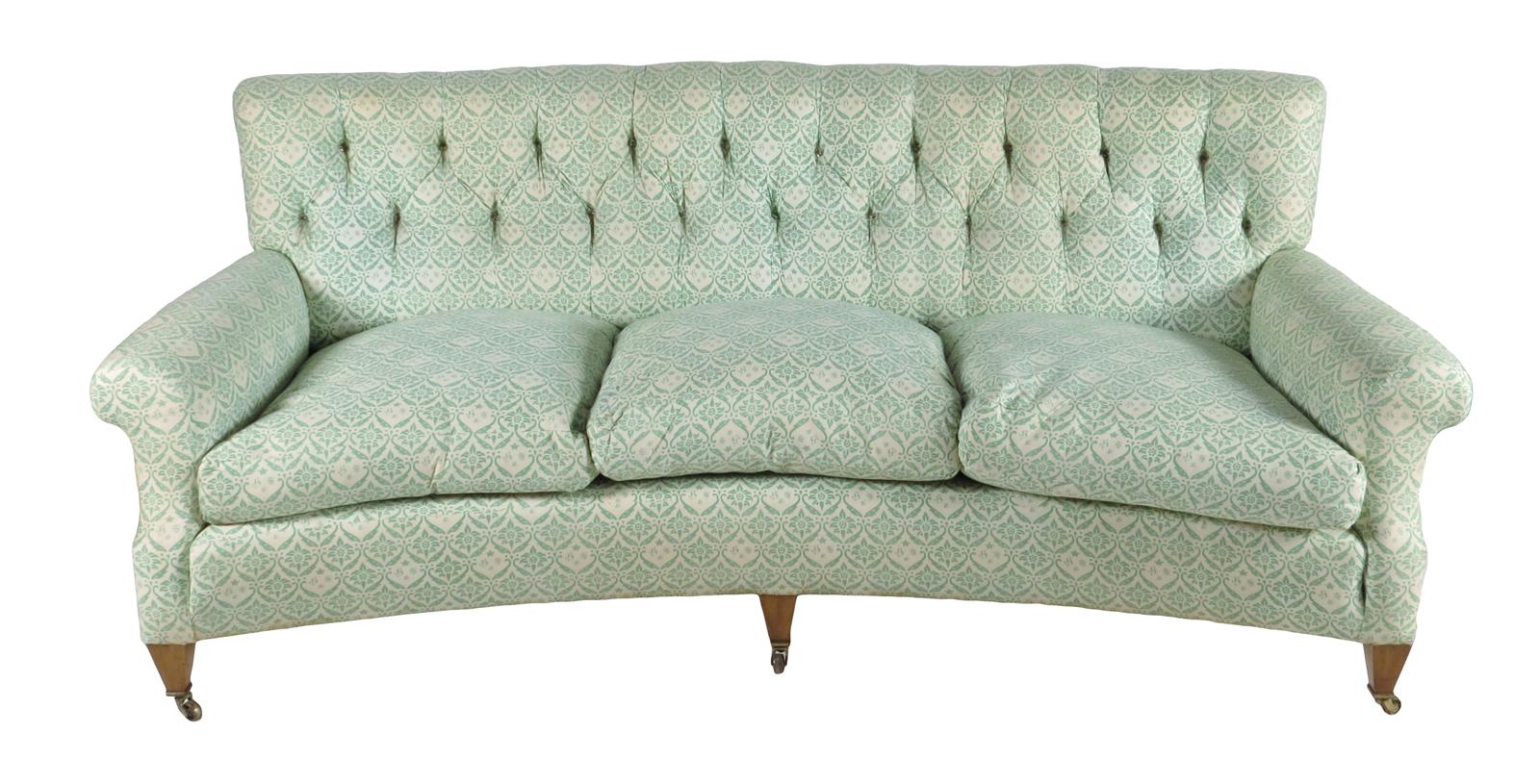 A Lenygon & Morant 'Howard' three seater sofa, with a button back and a concave front, with loose covers and 'H & S' monogrammed ticking, on beechwood supports and brass castors, one back leg stamped 'HOWARD CHAIRS 48 STH AUDLEY ST.', 82.6cm high, 200cm wide, 84cm deep.