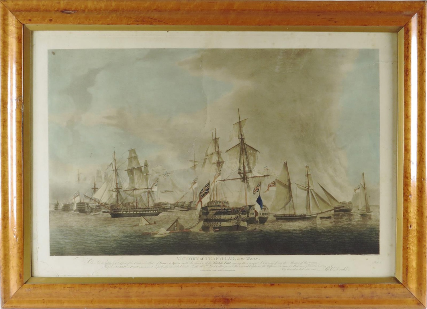 After Robert Dodd (1748-1815). Four coloured Trafalgar aquatints, the 'BATTLE OF TRAFALGAR, VAN DIVISION', 'VICTORY OF TRAFALGAR, IN THE VAN' , 'VICTORY OF TRAFALGAR, IN THE REAR' and 'BATTLE OF TRAFALGAR, REAR DIVISION', published by J.W. Laird, London 1843, 51.3 x 77, each in a glazed, bird's eye maple frame. (4)