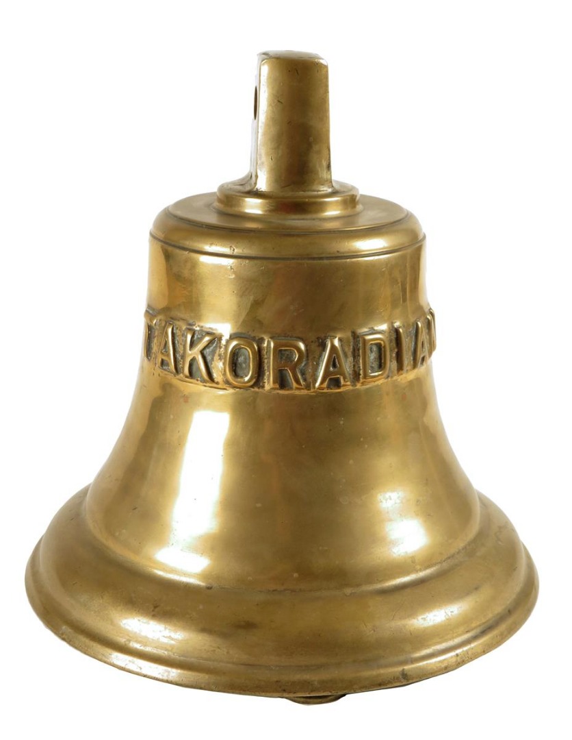 A bronze ship's bell, the body cast with the name 'TAKORADIAN', 29.8cm high, 28.8cm diameter.